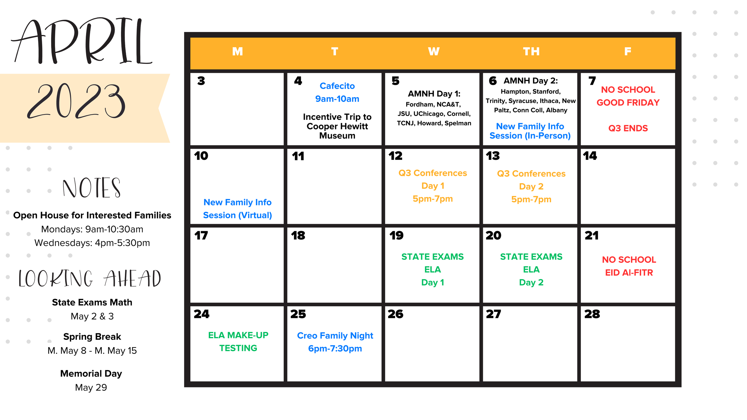 Oportunidad de voluntariado: Estamos buscando familias que nos ayuden a buscar estudiantes para el próximo año y difundir información sobre Creo en nuestra comunidad. ¡Por cada turno en el que sea voluntario, recibirá una tarjeta de regalo de visa de $50! Si está interesado, envíe un mensaje de texto al teléfono de la escuela al 347-216-9246.