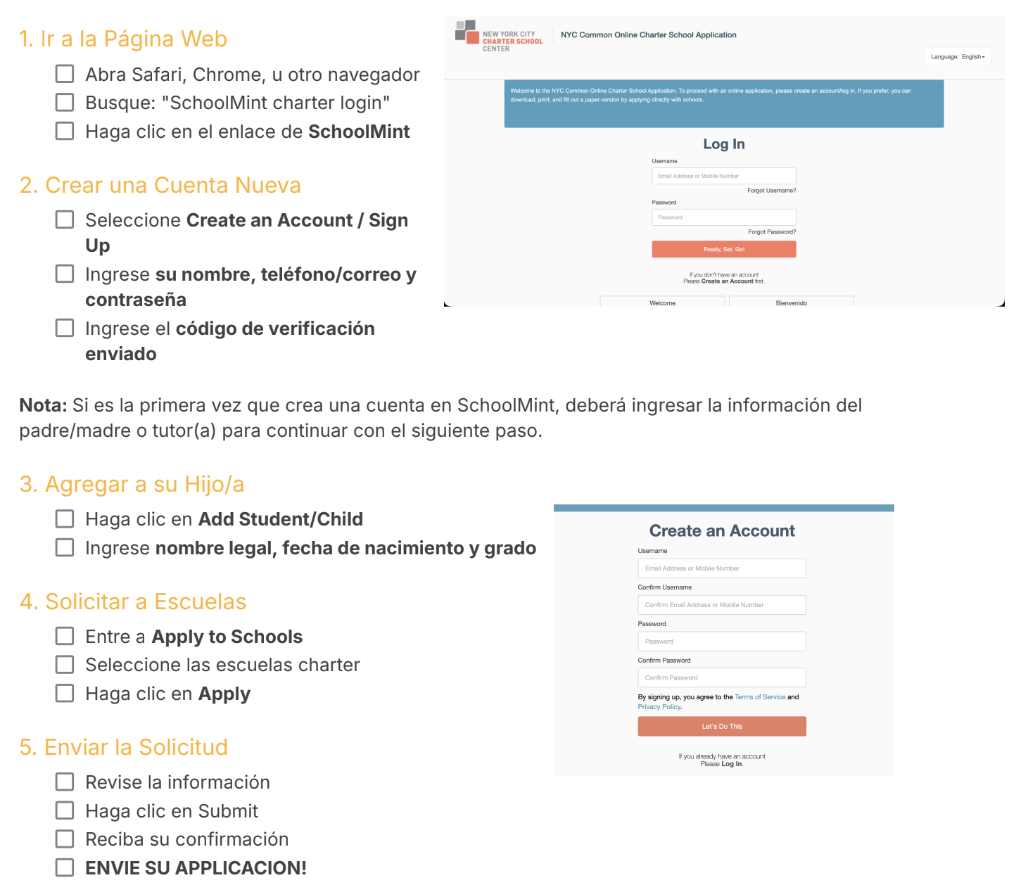 El proceso de admisión a las escuelas autónomas (charter) se gestiona a través de SchoolMint, donde las familias presentan sus solicitudes y seleccionan la escuela a la que desean optar mediante sorteo.